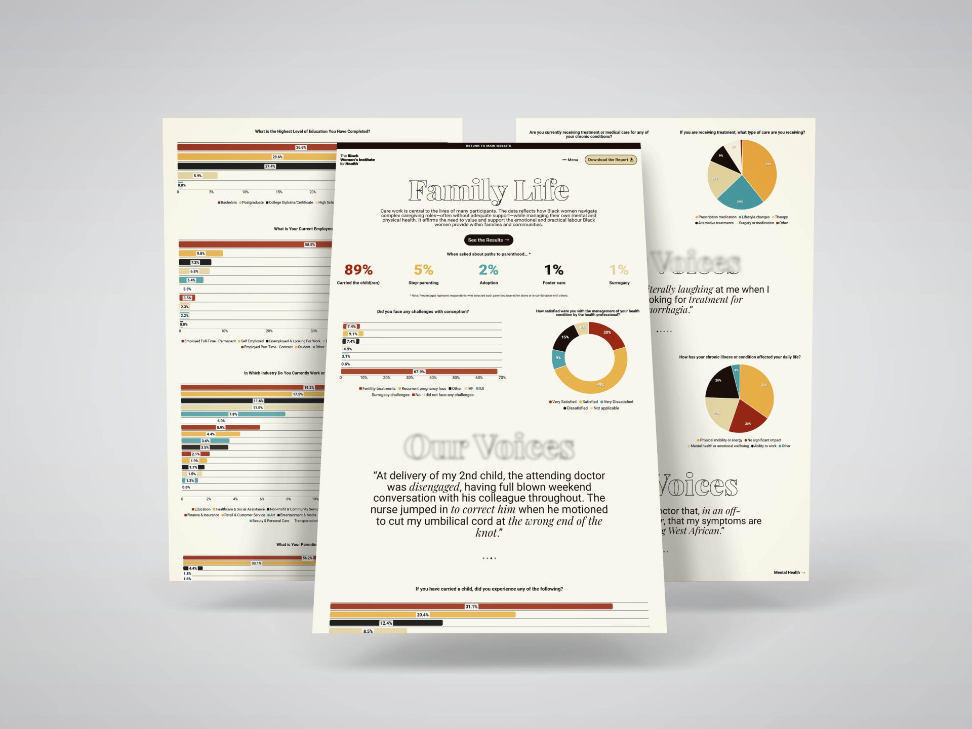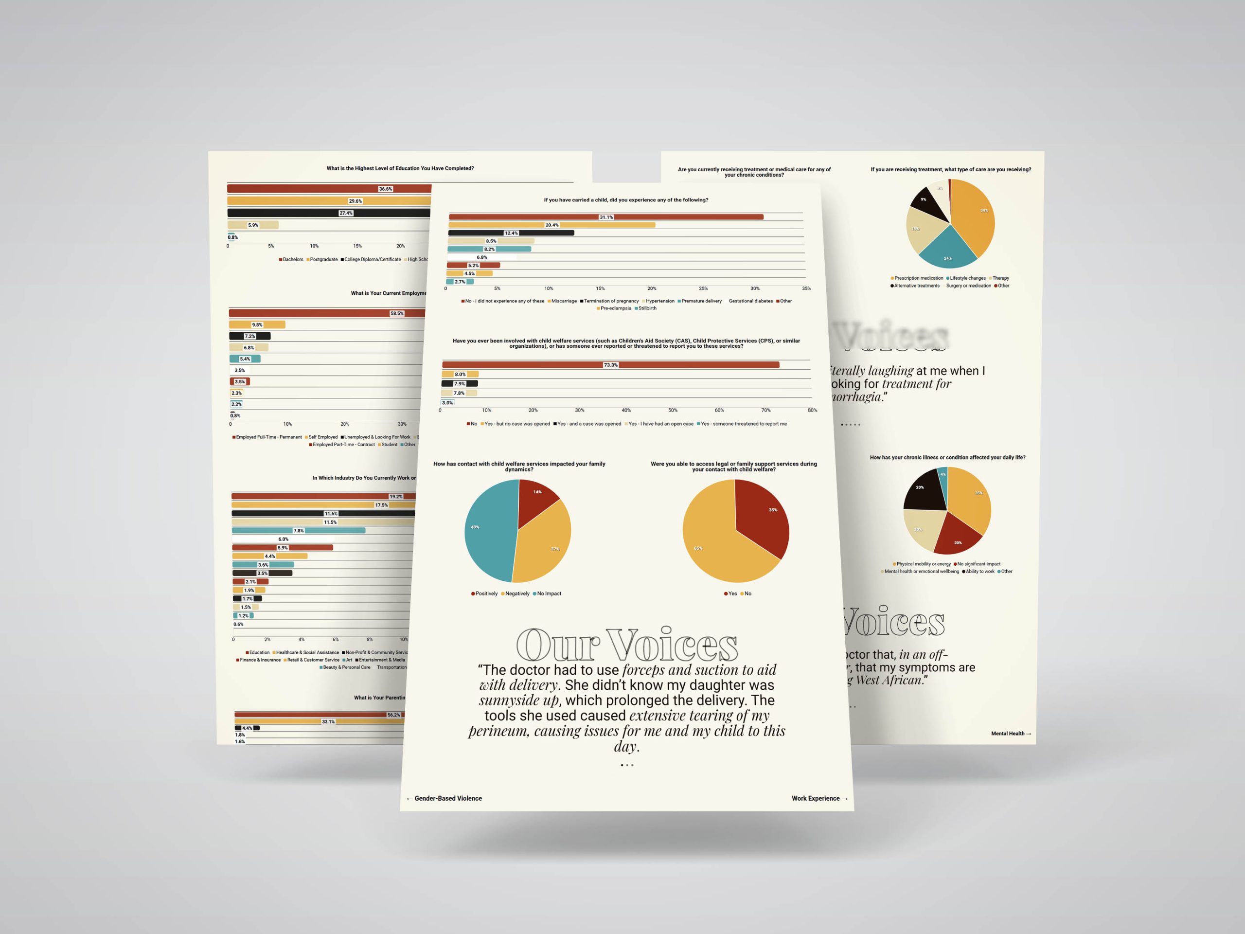 For the Voices UnHeard Data Portal, we designed a data-driven digital experience that translates a complex, high-impact survey into a visually intuitive narrative. The layout blends clean typography with a modular structure that allows each insight to stand on its own while maintaining a cohesive visual flow. We integrated a variety of graph styles – including bar charts, donut charts, counters, and pie charts – to ensure that both large and micro-percentages remained accessible and readable across devices. Each visual was styled in alignment with BWIH’s brand colors creating a research space that feels both authoritative and human-centered.